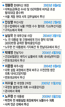 이듬해인 2004년에는 안상영 전 부산시장, 남상국 전 대우건설 사장 등 다섯명의 피의자가 잇따라 자살해 ‘자살 신드롬’까지 우려됐다. 안 전 시장은 운수업체에서 뇌물 1억원을 수수한 혐의로 구속기소됐고, 별건으로 서울에서 조사를 받고 내려온 뒤 2월4일 부산구치소에서 목을 매 숨진 채 발견됐다.