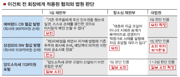 에버랜드 사건과 삼성SDS 사건은 모두 이건희 전 회장의 지시에 따라 비상장계열사의 전환사채(CB)나 신주인수권부사채(BW)를 헐값에 발행, 이재용 삼성전자 전무에게 배정하는 방법으로 재산을 부풀리거나 계열사 지배권을 획득하게 했다는 내용이다. 대법원이 비슷한 내용의 두 사건에 대해 정반대로 판단한 기준은 바로 사채 배정 방식이다. 재판부는 주주에게 우선 배정권을 줄 경우 회사의 자산 규모만 커질 뿐 지분구조 등에는 변동이 없기 때문에 저가에 사채를 발행한다고 해서 회사의 손해는 아니라고 봤다. 하지만 처음부터 제3자 배정을 하는 경우에는 기존주주가 아닌 사람에게 회사 지분 일부를 파는 셈이므로 제값을 받을 의무가 있다는 것이다.