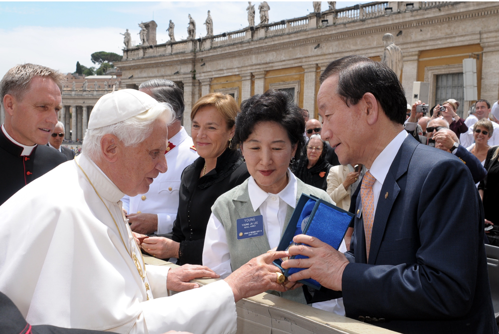 이동건 국제로타리 회장 내외가 10일 로마 교황청을 방문해 베네딕트 16세에게 국제로타리 기념패를 전하고 있다.