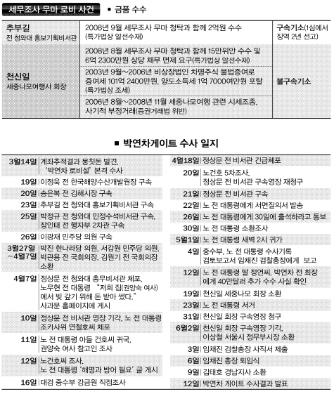 또 천 회장이 “조용해지면 사면받을 수 있도록 도와주겠다.”고 말하고, 추부길 전 청와대 홍보기획비서관이 “한나라당 이상득 의원에게 청탁 전화를 걸었다.”고 진술했지만 검찰은 ‘실패한 로비’라며 수사를 확대하지 않았다. 결국 세무조사 무마 로비 의혹과 관련해서는 추 전 비서관과 천 회장만 법정에 서게 됐다.