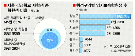 서울 시내 각급 학교 재학생 2명 가운데 1명은 각종 학원에 다니고 있는 것으로 나타났다. 또 재학생 3명 가운데 1명은 특목고나 대학 입시를 위한 입시·보습학원에 다니고 있었다.