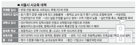 시교육청은 또 외고 입시 영어듣기평가 문제를 서울 지역 6개 외고가 공동 출제하도록 했다. 시험 난이도는 중학교 교사가 참여해 조정한다. 영어듣기 시험이 너무 어려워 사교육을 유발한다는 지적에 따른 조치다.
