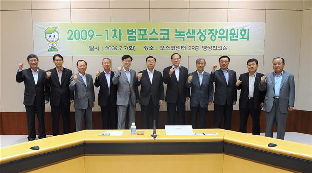 포스코는 7일 서울 대치동 포스코센터에서 ‘범(汎)포스코 녹색성장위원회’를 출범하고 포스코의 녹색성장 비전으로 ‘글로벌 녹색성장 리더(Global Green Growth Leader)’를 채택했다. 정준양(왼쪽 여섯 번째) 포스코 회장이 위원장을 맡고 이동희 포스코 사장 등 포스코 임원 8명, 포스코건설과 포스데이타 등 출자사 대표 10명으로 구성된다.