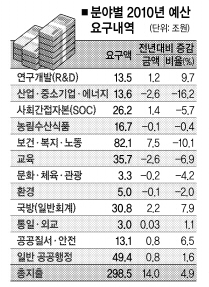 요구액은 올해 본예산에 비해 4.9% 증가한 298조 5000억원으로 집계됐다. 추가경정 예산을 포함한 올해 총 예산과 비교하면 1.1% 감소한 수준이다. 재정부는 오는 9월까지 각 부처와 협의를 통해 정부안을 확정한 뒤 10월2일까지 국회에 제출할 예정이다.