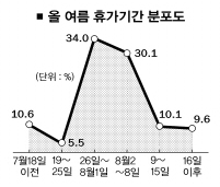 10일 국토해양부에 따르면 한국교통연구원에 의뢰해 전국의 4000가구를 대상으로 전화설문조사를 한 결과 응답 가구의 28.3%가 여름휴가를 떠날 계획이라고 답했다. 이는 지난해 조사 때보다 6.1% 포인트 낮은 것이다. 휴가 시기는 이들 중 가장 많은 34%가 7월26일~8월1일을 꼽았고, 8월2~8일(30.1%), 8월9~15일(10.1%) 순이었다.