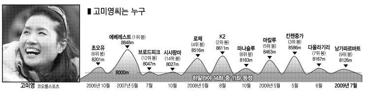 11일 히말라야 낭가파르바트에서 하산하다가 조난당한 고미영씨는 오은선(43·블랙야크)과 함께 국내 여성 산악인의 대표 주자로 꼽힌다. 두 사람은 히말라야 8000m급 14좌 세계 첫 등정이라는 기록을 놓고 치열한 경쟁을 벌여왔다. 앞서거니 뒤서거니 하며 각각 11개와 12개를 올라 세간의 관심을 모았다. 고미영은 낭가파르바트 정상에 오른 후 소속사를 통해 “남은 3개 봉도 안전하게 등정해 대한민국 여성의 기상을 전 세계에 떨치겠다.”며 14좌 등정에 강한 의욕을 드러낸 바 있다.