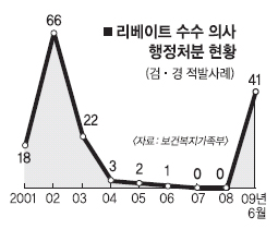 그러나 리베이트가 적발돼 행정처분을 받은 의사는 2001년 이후 153명에 불과하다. 2007~2008년에는 단 한명도 면허정지처분을 받은 사례가 없다. 복지부는 처벌기간 경감 조항 삭제를 추진하고 있지만 대폭적인 처벌 강화방안은 의료단체의 반발로 추진이 쉽지 않은 상태다. 다만 민주당 박은수 의원이 지난달 “의사와 약사가 의약품 구매와 관련해 부당한 금품을 제공받을 경우 면허정지 처분을 강화해야 한다.”며 의료법·약사법 개정안을 국회에 제출해 주목된다. 의료인의 자격정지 처분을 최대 1년 이내로 늘리는 것이 골자다.