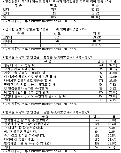 합격 후의 일에 관한 얘기 등 합격을 직감케 하는 ‘말’도 있었다.이런 유의 질문은 ▲“합격하면 바로 일 할 수 있나요”(63.6%) ▲“합격한다면 잘 할 수 있겠어요”(33.8%)가 가장 많았다. 또 ▲“인상이 참 좋으시네요”(24.4%) ▲“좋은 결과 있기를 기대합니다”(20.5%) ▲“결정되면 바로 연락 드리겠습니다”(16.4%) ▲“네, 그 정도면 됐습니다”(7.3%) ▲“그 대답은 참 잘 하셨습니다”(5.4%) 등의 응답이 나왔다.