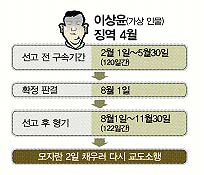 형사소송법은 무죄추정의 원칙에 따라 형이 확정된 날부터 징역 형기(刑期)를 계산하도록 규정한다. 이씨의 경우 8월1일부터 11월30일까지 122일간 교도소에 갇혀 있어야 한다. 문제는 월마다 일수가 28일, 30일, 31일로 다르다는 것. 이씨가 실제로 구치소에 갇혀 있던 기간(2월1일~5월30일)은 그래서 120일밖에 되지 않는다. 법원이 선고한 형량에 2일이 모자란다. 때문에 이씨는 남은 이틀을 채우러 교도소에 가야 한다.