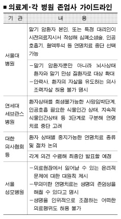 연세대 세브란스병원도 5월21일 존엄사 가이드라인을 마련했다. 지속적 식물인간 상태, 인공호흡이 필요한 식물인간 상태, 회생불가능한 사망임박단계 등 3단계로 구분해 연명치료를 중단할 수 있는 기준을 제시했다.