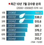 이는 1973년 관측이 시작된 이래 네 번째로 많다. 이달 말 장맛비가 다시 내릴 가능성이 커 기록 순위는 더 올라갈 수도 있다. 최근 10년간 강수량 1위는 2006년(703.3㎜), 2위는 2003년(538.2㎜)이었다.