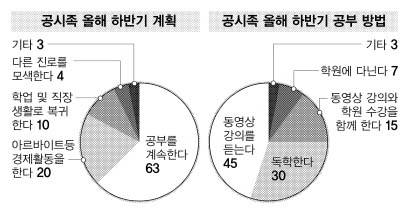 수험생들이 가장 선호하는 공부방법은 동영상 강의를 이용하는 것이었다. 올 하반기 공부계획을 물은 결과 45%가 ‘동영상 강의를 청취하겠다.’고 밝혔고 ‘동영상 강의와 학원 수강을 함께 하겠다.’는 응답도 15%에 달했다. 반면 ‘학원 수강만 하겠다.’는 답은 7%에 그쳤다.