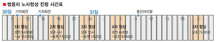 30일 오전 9시10분에 시작된 노사교섭은 사측이 취재진의 출입을 통제한 채 비공개로 진행해 협상 상황에 대한 궁금증을 증폭시켰다. 사측은 교섭 시작 이후 오전과 오후 두 차례에 걸쳐 기자들을 찾아 브리핑하고 있지만 대체로 원론적인 입장 외에 구체적인 교섭내용은 밝히지 않았다. 공장 바깥 출입이 자유롭지 못한 노조는 브리핑조차 없이 노조 홈페이지를 통해 자신들의 입장을 드러냈다.