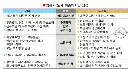 사측은 이에 대해 그동안 노조가 줄기차게 주장해온 ‘총고용 보장’과 같은 맥락이라고 판단했다. 사측은 노조 점거농성 이후 총고용 얘기만 나오면 알레르기 반응을 일으켜 왔다. 또 정리해고(희망퇴직) 대상자를 최종안 450명에서 331명으로 줄였지만 노조는 스스로 희망퇴직을 신청한 40여명을 제외하고는 정리해고를 인정할 수 없다는 입장을 고수한 것에 대해 불쾌감을 감추지 못했다.