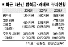 행정안전부와 경찰청이 3일 공개한 자료에 따르면 지난해 신호위반, 과속 등 교통법규 위반과 주·정차 위반 등으로 발부된 범칙금과 과태료는 각각 1558억원, 8722억원(경찰청 4758억원+지방자치단체 3964억원)이었다. 지난해말 차량 등록대수가 1679만 5000대로, 차량 1대당 평균 6만 1200원의 벌금이 부과된 셈이다. 범칙금은 경찰이 현장에서 단속하는 교통법규 위반이며, 무인카메라 단속은 1차 범칙금이 부과된 후 기간 내에 자진 납부하지 않으면 범칙금에 1만원을 더 붙여 과태료로 전환된다. 지방자치단체가 단속권한을 갖고 있는 주·정차 위반은 모두 과태료로 부과된다.