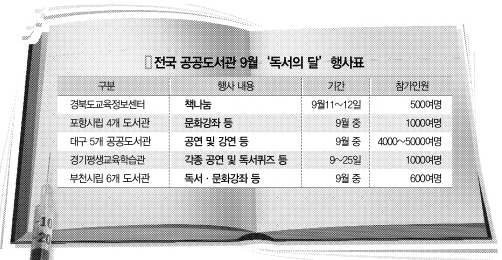 4일 각 자치단체와 교육청에 따르면 이달 중에 전국 각지에서는 독후감 공모를 비롯해 책 읽기 캠페인, 독서 퀴즈, 책 교환전 등 다양한 독서 관련 행사가 열린다.