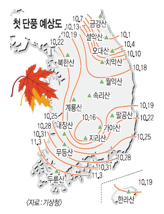 단풍 절정기의 경우 설악산은 10월20일, 내장산은 11월5일 전후로 예상되고 중부지방·지리산은 다음달 24~29일쯤, 남부지방은 11월 상순으로 관측된다. 보통 하루 최저기온이 5도 이하로 떨어지기 시작하면 단풍이 드는데 단풍이 산 전체의 20%를 차지하면 첫 단풍, 80% 정도면 절정기라고 본다.