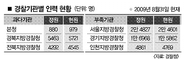 경찰청별 인력 수급 불균형 현상이 해소되지 않고 있는 것으로 나타났다. 11일 서울신문이 입수한 ‘경찰기관별 정·현원 현황’에 따르면 8월 말 현재 전체 경찰 현원은 9만 9200명으로 정원 9만 9554명에 비해 354명이 부족하다. 그렇지만 경찰중앙학교에서 교육을 받고 있는 300여명이 제외된 수치인 만큼 정원과 현원이 일치한다는 것이 경찰의 설명이다.