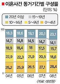 2007년까지는 4년 미만 부부의 이혼 비중이 가장 높고 5∼9년차 부부가 그 뒤를 이었지만 지난해 처음으로 20년 이상 부부의 이혼 비율이 5∼9년차 부부를 앞질렀다.