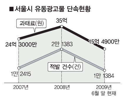 입간판의 경우 지난해 18만 979건이 단속됐다. 월 평균 1만 5081건이며 25개 구청을 산술적으로 나누면 구청당 하루 평균 30개꼴이다. 그러나 단속 주체인 구청들은 단속 인력이 부족한 데다 ‘설치(배포)-벌금-재설치(재배포)’로 이어지는 악순환이 반복된다고 하소연한다.
