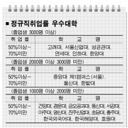 조사 결과를 보면 졸업자 3000명이상 대학(산업대 포함) 가운데 취업률이 70%이상인 대학은 고려대, 성균관대, 동아대, 서울산업대, 연세대, 원광대, 한양대 등 7개교였다. 졸업자 2000명 이상 3000명 미만인 대학 가운데서는 중앙대, 숙명여대, 신라대, 경희대 등 13개 대학이 취업률 상위 그룹에 속했다.