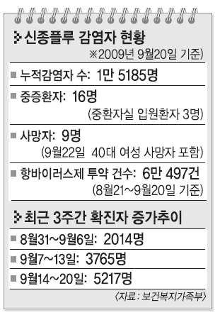 13명은 폐렴 등의 합병증이 발생, 입원치료를 받고 있다. 신종플루 확진판정을 받은 환자는 지난 14~20일 일주일 동안 5217명이 늘어나는 등 20일 기준으로 총 1만 5185명으로 집계됐다. 17일에는 하루 동안 982명이 확진판정을 받아 일일 기록을 갈아치웠다.