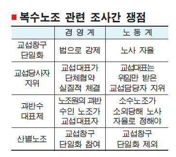 복수노조 허용을 둘러싼 최대 쟁점은 교섭창구 단일화와 노조전임자 임금 지급 금지 여부다.정부가 이번 정기국회에 노동조합법 개정안을 제출할 때 핵심 사안도 이 부분이다.