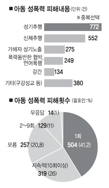 피해내용(중복 선택)으로는 성기추행이 56.1%(772건), 신체추행 51.7%(552건), 가해자 성기노출 29%(275건), 폭력을 동반한 협박·언어폭행 16.7%(249건), 강간 9.3%(134건) 순이었다. 센터측은 “성기 및 신체추행시 아동이 거부하면 팔다리를 묶는 등 폭력을 동반하거나 사건에 대해 입을 다물라고 협박하는 경우가 많다.”고 설명했다. 두 가지 이상의 중복피해를 당한 경우는 620건으로 57.4%에 달했다. 피해횟수는 1회가 41.2%(504건)였지만 10회 이상의 지속적 피해도 26%(319건)나 됐다. 2~9회의 중복피해는 129건(11%), 모른다는 응답은 20.8%(257건)였다. 피해자의 나이가 어려 성폭력에 대한 인식이 부족한 경우다.
