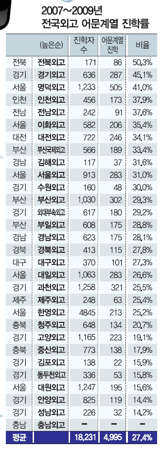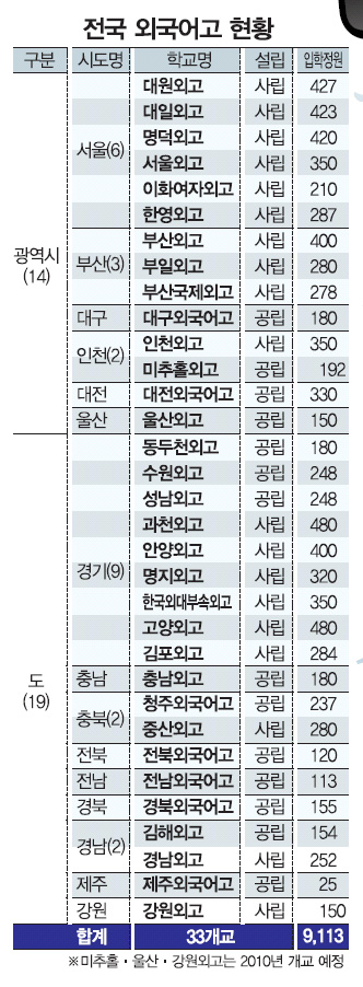 하지만 해외여행 자유화 등으로 외고 설립취지는 퇴색됐고 현재는 명문대 진학을 위한 입시기관으로 전락한 상태다. 내년 개교예정인 3개교 등 전체 33개 외고 가운데 졸업생을 배출한 29개 외고의 동일계 진학률은 30% 미만이다. 입학 설명회에 사시, 외시, 행시 합격자 수를 공개하는 외고가 있을 정도로 당초 설립목적이 유명무실해진 상태다. 그러는 사이 외고에 따른 사교육 부담은 눈덩이처럼 불어났다.