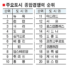 결과에 따르면 6개 분야의 종합경쟁력 1위는 뉴욕(330.4점), 2위는 런던(322.3), 3위는 파리(317.8), 4위는 도쿄(305.6), 5위는 싱가포르(274.4) 등이다. 서울은 241.1점으로 12위다. 30개 도시를 대상으로 한 재단의 첫 평가에서 한국은 13위였다. 싱가포르는 지난해 11위에서 5위, 취리히는 15위에서 9위, 홍콩은 17위에서 10위로 뛰어올랐다.