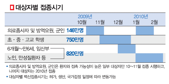 한편 보건복지가족부 중앙인플루엔자 대책본부는 다음달 중순부터 시작되는 학생 대상 예방접종에서 신경계질환 장애아동이 다니는 특수학교 학생을 최우선 접종대상자로 검토 중인 것으로 알려졌다.
