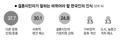 그러나 ‘한국사회는 외국인에게 차별적인가.’라는 물음에 66.9%가 공감한다고 밝혔다. 차별요인으로 출신국가(51.0%), 언어(23.7%), 직업(11.6%), 피부색(10.4%) 등을 꼽았다. 이들은 다른 문화를 존중·인정하는 국민의식 전환(37.7%)과 한국어 교육 및 상담(26.4%) 등이 필요하다는 의견을 제시했다.