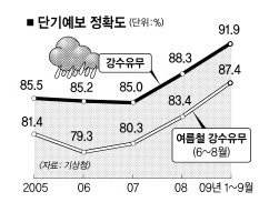 11일 기상청에 따르면 올 1~9월까지 단기예보 정확도가 91.9%를 기록, 정확도면에서 기상 선진국인 일본(84.8%)을 크게 앞질렀다. 이에 따라 국정감사의 단골메뉴였던 기상오보 질타도 올해는 찾아볼 수 없었다.