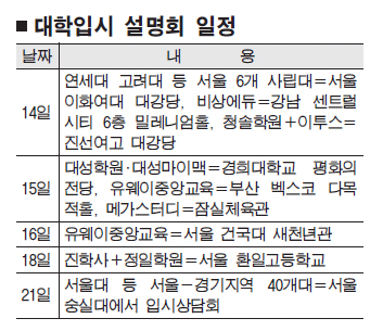 유웨이중앙교육은 하루 뒤인 15일 부산 벡스코 다목적홀에서 입시설명회를 실시한다. 같은 날 메가스터디는 서울 잠실체육관에서, 대성학원과 대성마이맥은 서울 경희대 평화의 전당에서 각각 입시설명회를 연다.