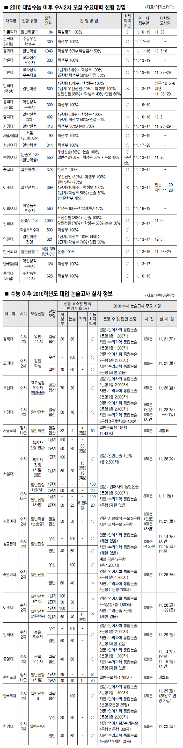 예를 들면, 아주대 일반전형2의 경우 모집인원의 30%는 학생부 100%로, 나머지 모집인원의 70%는 1단계 학생부로 10배수를 선발한 후 2단계 교과 50%+논술 50%로, 수능 최저 학력 기준을 전혀 반영하지 않고 최종 선발한다.