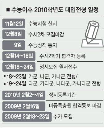 2010학년도 대입수능 수험생들이 12일 본 수능시험 성적표는 다음달 9일 나오고 정시모집 원서접수는 같은 달 18일부터다. 수험생들이 자칫 시간적 여유를 느낄 수 있다. 하지만 정시모집에 앞서 수시 2차 모집 기회도 남아 있는 만큼 가채점 결과를 토대로 주어진 응시기회를 최대한 활용하는 지혜가 필요한 때다.