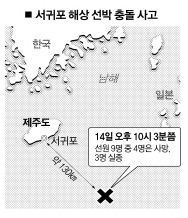 14일 오후 10시3분쯤 서귀포시 남동쪽 약 130㎞ 해상에서 29t짜리 여수선적 연승어선 3대경호가 홍콩선적 화물선 조슈 마루호(3836t)와 충돌, 침몰했다.