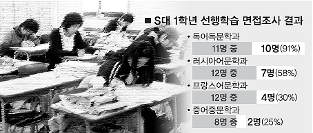 서울신문이 서울 사립 S대 문과대 학부생 가운데 내년 독어독문학과 전공을 결정한 전체 11명 중 10명을 면접조사한 결과 모두 학기 중 또는 방학 기간 동안 학원에서 전공과목을 선행학습할 예정인 것으로 확인됐다.