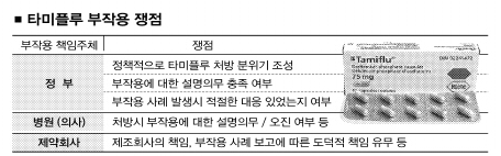 신종플루 백신은 부작용에 대한 책임을 정부가 떠맡고 있지만 타미플루는 일반 병원의 처방을 받아 사용하는 약이라서 부작용 발생시 책임의 주체가 불분명하기 때문이다. 피해자들이 타미플루의 부작용 문제를 법정으로 끌고갈 경우 제약사와 병원, 정부가 책임 소재를 두고 치열하게 다툴 수 밖에 없다.