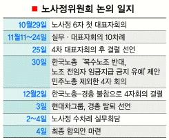 그러나 변수가 하나 더 발생했다. 노조 문제의 ‘맏형’ 현대기아차 그룹이 경총의 입장에 반발, 3일 오전 경총을 탈퇴한 것이다. 그렇다고 협상 타결의 큰 흐름을 막지는 못했다. 안상수 한나라당 원내대표도 근로자 수에 따라 전임자 임금지급 금지를 차등 시행하고, 경총과 노총이 합의안 도출에 실패하면 독자적인 절충안을 마련한다고 밝히면서 노사를 압박했다.