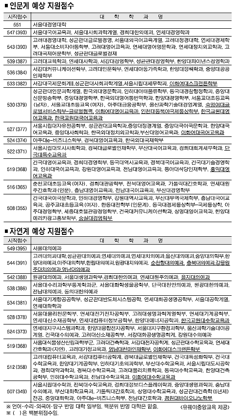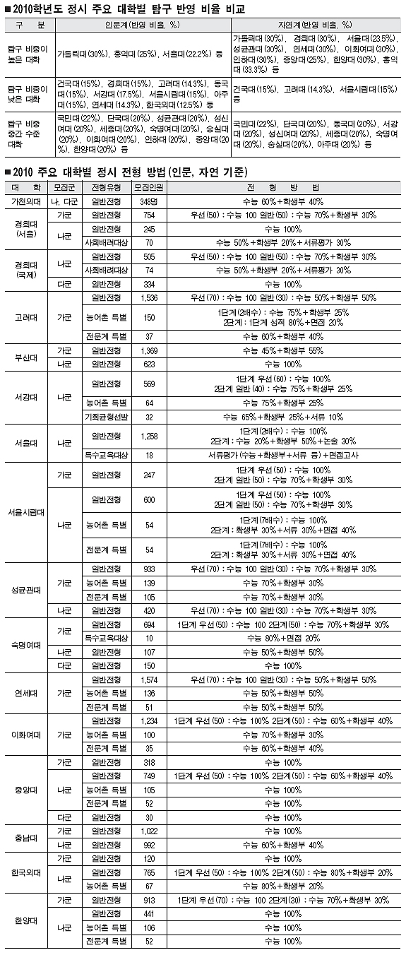 대학별 수능 반영 방법을 분석하는 것은 필수. 대학별로 수능 반영 영역과 탐구영역 반영 과목 수, 특정 영역 가산점 부여 여부 등을 따져야 한다. 서울대는 인문계·자연계를 막론하고 수리영역 반영 비율이 높지만, 연세대 인문계의 경우 언어·수리·외국어 반영 비율이 높고 자연계의 경우 수리와 과탐 반영 비율이 높은 식으로 학교마다 차이가 있다. 고려대는 인문·자연계 모두에서 수리·외국어 반영 비율이 높고 탐구영역 반영 비율이 상대적으로 낮다.