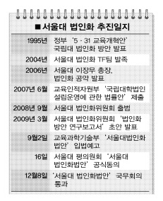 국무회의를 통과한 서울대 법인화 법률안은 자율성을 강화하고 정부의 지원을 계속하는 것이 핵심이다. 항간에 “줄 것은 다줬다.”는 말이 나올 정도로 특혜의혹이 불거져 향후 부담으로 작용할 전망이다.