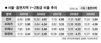 그런가 하면 최근 5년간의 수능 성적을 분석한 건국대 김진영 교수는 “학생 수가 많은 학교의 성적이 높고, 지역 요인이 특히 외국어에 큰 영향을 주고 있다.”고 밝혔다. 이 연구 결과는 읍·면 지역 학생들의 평균 성적이 도시권 학생들보다 과목별로 7.709에서 최고 9.653점이나 낮다는 서울교대 김성식 교수의 연구와 일맥상통했다.
