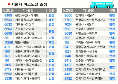 서울시는 지난달 30일 노선조정분과위원회를 열어 ‘2009년도 하반기 시내버스 노선조정안’을 확정했다고 9일 밝혔다. 조정 대상은 노선 변경 15개, 연장 3개, 단축 3개, 폐선 2개, 통합 3개, 신설 1개 등 모두 27개 노선이다.