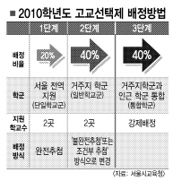 수정안이 나오기 전 시교육청의 원안은 1-2-3단계 모두 ‘완전추첨’ 방식이었다. 1단계에서는 학생들이 서울의 전체 학교 중 2개교를 골라 지원하면 추첨을 통해 정원의 20%를 배정하고, 2단계에서는 거주지 학교군의 2개 학교를 선택해 지원하면 정원의 40%를 배정하는 방식이다. 3단계에서는 통학편의와 1~2단계 지원상황 등을 고려해 추첨배정된다.