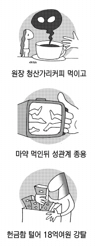 A씨 등은 또 지난해 2월7일~3월19일 같은 수련원에서 회원들에게 졸피뎀 등 향정신성의약품을 탄 음료수를 마시게 한 뒤 70여차례에 걸쳐 성관계를 맺도록 종용한 것으로 드러났다. 이어 각각의 성관계 장면을 비디오로 촬영한 뒤 자신들의 지시에 따르지 않을 경우 인터넷에 유포하겠다고 협박한 혐의도 받고 있다. 또 2007년 6월10일 이 수련원 회원들이 낸 헌금 보관함을 열어 1500만원을 훔치는 등 모두 83차례에 걸쳐 18억 5000만원 상당의 금품을 훔치기도 했다는 것이다.