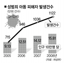 18일 여성부에 따르면 한국여성정책연구원에 의뢰해 실시한 ‘여성·아동 안전지표체계 구축 및 개발’ 연구결과 아동인구 10만명당 성폭력 범죄 피해아동 수는 2005년 9.1명, 2006년 12.5명, 2007년 14.1명, 2008년 15.8명으로 늘어났다. 최근 3년간 73.2% 증가한 수치다.