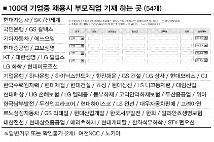 반면 삼성·포스코·롯데·우리은행 등 44개 대기업은 부모의 직업과 학력을 쓰지 못하도록 입사지원서에서 이런 항목을 삭제했다. 여천NCC·노키아는 답변을 거부했다.