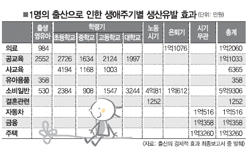 이 가운데 출생에서 학령기까지의 소비를 통한 고용효과는 0.885명으로, 자신이 노동시장에 들어가기 전에 이미 1개의 일자리를 창출하는 효과를 내는 셈이다.