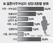 상담자를 출신국가별로 보면 베트남 이주 여성 상담실적이 2만 8417건(40.4%)으로 가장 많았다. 베트남 여성과의 국제결혼이 대폭 늘어나고 있는 현실을 반영한 것이다. 이어 중국 1만 9905건(28.3%), 몽골 6725건(9.6%), 필리핀 4806건(6.8%) 등의 순이었다.